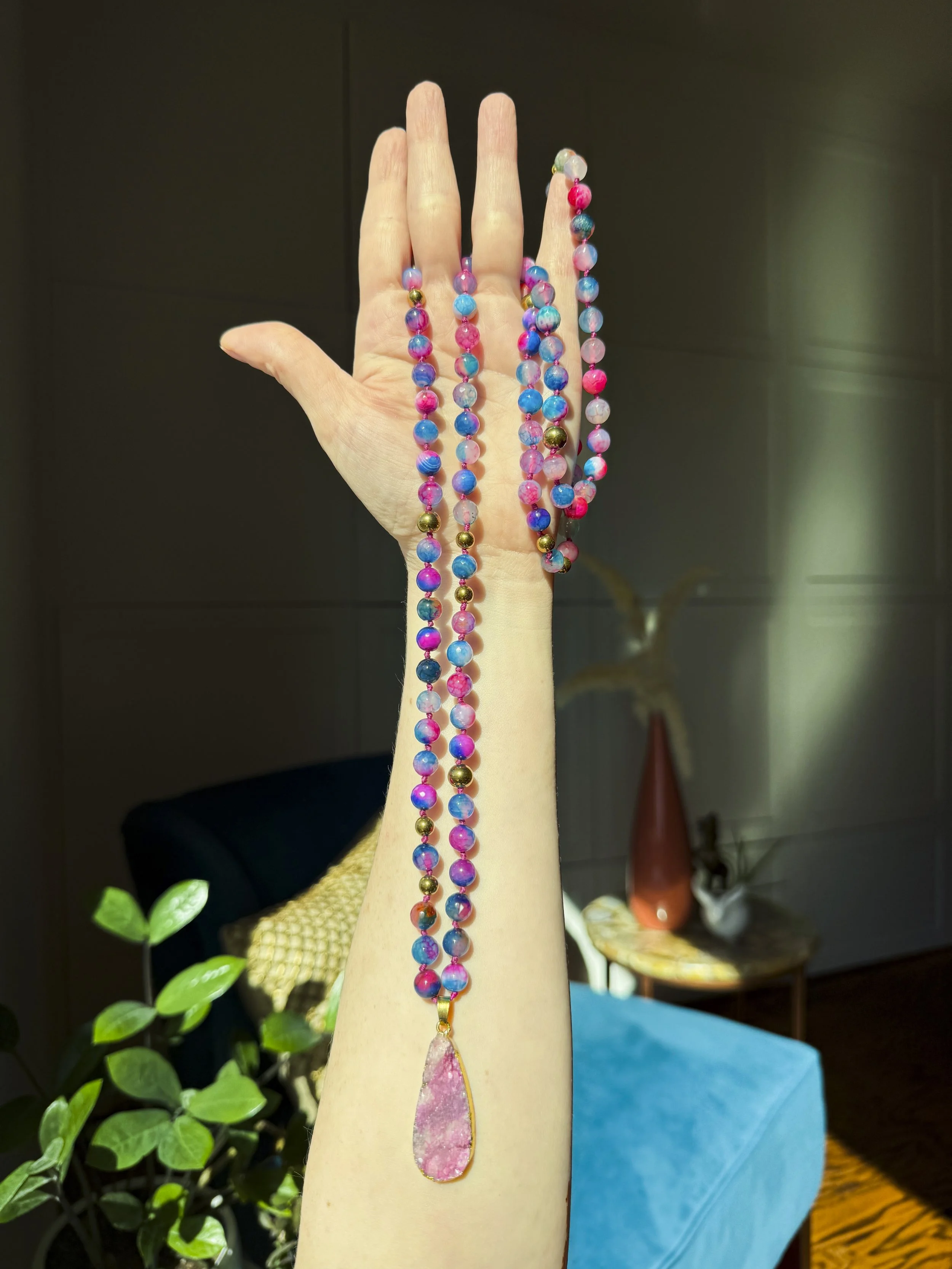Striking combinations, vivid colors, and splashes of sparkle are key characteristics of my design style. Each mala and necklace in my shop is a unique pattern, dreamed up by me. No two pendants are alike and each stone is distinctly chosen. Between each gemstone there is a sturdy hand tied knot, knotted with love.